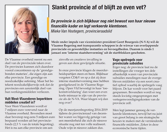 Provincieraadslid Mieke Van Hootegem in het huis-aan-huisblad van N-VA Roeselare (februari 2014): "De provincie is zich blijkbaar nog niet bewust van haar nieuwe financiële kader en legt verkeerde klemtonen."