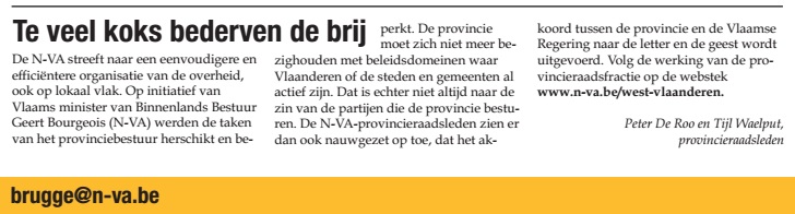 De N-VA streeft naar een eenvoudigere en efficiëntere organisatie van de overheid, ook op lokaal vlak. Op initiatief van Vlaams minister van Binnenlands Bestuur Geert Bourgeois (N-VA) werden de taken van het provinciebestuur herschikt en beperkt. De provincie moet zich niet meer bezighouden met beleidsdomeinen waar Vlaanderen of de steden en gemeenten al actief zijn. Dat is echter niet altijd naar de zin van de partijen die de provincie besturen. De N-VA-provincieraadsleden zien er dan ook nauwgezet op toe, dat het akkoord tussen de provincie en de Vlaamse Regering naar de letter en de geest wordt uitgevoerd. Volg de werking van de provincieraadsfractie op de webstek www.n-va.be/west-vlaanderen.